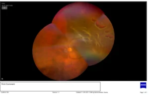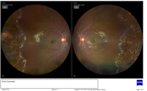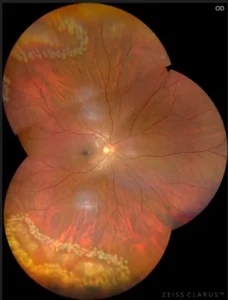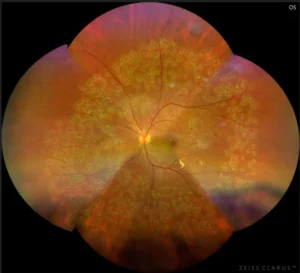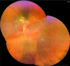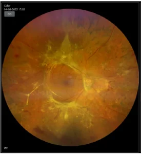 Ultra-wide field fundus shows post-operative – treated with laser panretinal photocoagulation (PRP) with vitrectomy