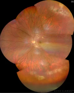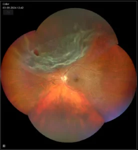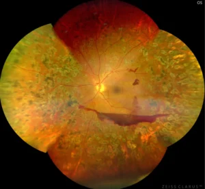Ultra-wide field fundus image shows Retinal detachment with multiple horseshoe shaped tears