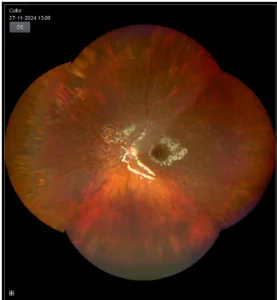 Ultra-wide field fundus shows post-operative – treated with laser panretinal photocoagulation (PRP) with vitrectomy